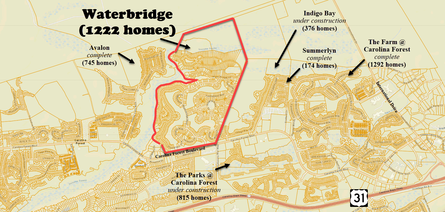 As of June 2024, Horry County has approved the development of 1,222 single family homes in Waterbridge. As of June 2024, 899 single family homes have been platted, 570 single family homes have been developed, and 652 single family homes remain to be developed in the new home community of Waterbridge in Carolina Forest.